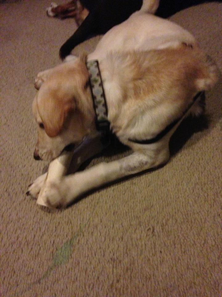 It is almost a month since Jake' surgery and he is doing very well. His sutures were just removed and his doctor says he is healing well. He can now open his mouth approx four inches compared to a half inch prior to surgery. He no longer has to stick his nose in his food and water just to eat and drink, and he now pants normally. In the latest photos we posted, you can see Jake chewing on a bone for the first time, just like a regular dog! We are thrilled with Jake's progress, and we're optimistic he will continue to show improvement. Jake will be on pain killers and steroids for the next few months and will need to continue therapy to keep his jaw mobile to promote his healing. Thanks for your support so we can help keep Jake on the path to recovery!